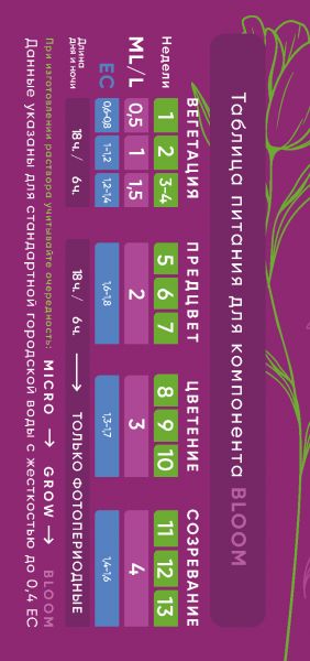 1 неделя Ес 0,6-0,8 Grow 0,5 ml Micro 0,5 ml Bloom 0,5 ml2 неделя Ес 1-1,2 Grow 1 ml Micro 1 ml Bloom 1 ml