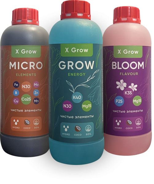 Комплект состоит из 3 привычных компонентов Grow, Bloom, Micro это дает возможность использовать не только нашу схему питания но и делать Вам свои.